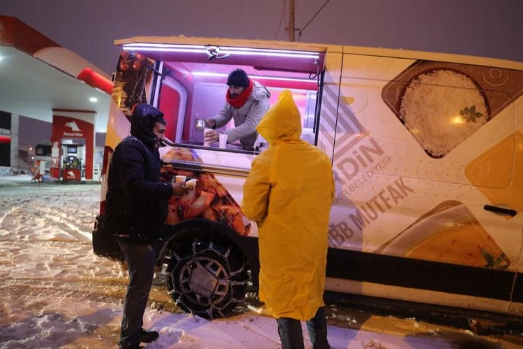 Mardin Büyükşehir Belediyesi kentte etkili olan kar yağışı dolayısıyla yollarda zorluk çeken vatandaşlara çorba ikramında bulunuyor.
