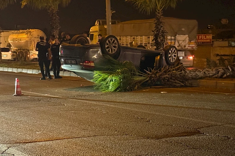 47 ADU 969 plakalı otomobil, henüz kimliği belirlenemeyen sürücüsünün direksiyon hakimiyetini kaybetmesiyle palmiye ağacına çarparak takla attı.