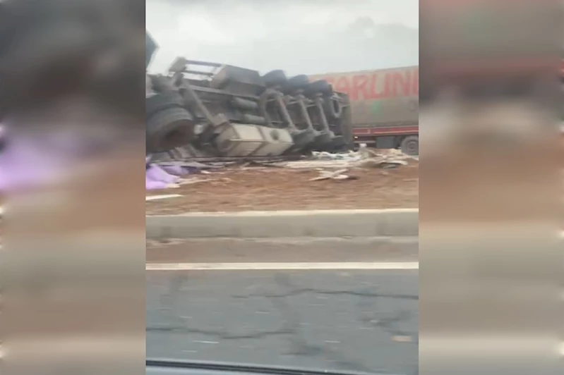 Edinilen bilgiye göre, plakası belirlenemeyen tır, sürücüsünün direksiyon hakimiyetini kaybetmesi sonucu kontrolden çıkarak devrildi.