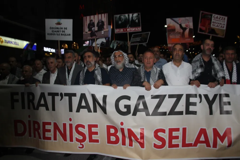 Valilik Parkı önünde başlayan ve 15 Temmuz Şehitler Meydanında bulunan Şakir Nuhoğlu Camii önünde sona eren yürüyüş boyunca kalabalık, ellerinde Filistin bayrakları ile ‘Mardin’den Gazze’ye direnişe bin selam’ sloganları attı.