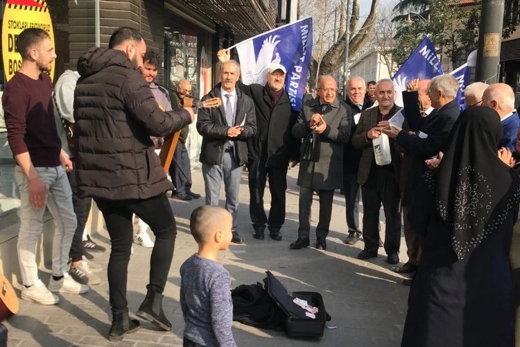 Millet Partisi Bursa İl Başkanı Hüsamettin Akyıldız da “Teşkilat üyelerimiz ile birlikte kadim şehrimizin dört bir yanını adeta ilmek ilmek dokuyoruz. Kıymetli vatandaşlarımızdan yönetimimizi desteklemelerini, bizlere inanmalarını ve denenmemiş kadrolarımızı denemelerini istiyoruz. Bize sokakta, işyerinde teveccüh gösteren tüm vatandaşlarımıza teşekkür ediyoruz. 31 Mart günü de mührü, partimizin logosunda yer alan çift başlı kartalın altına basmalarını bekliyoruz. İnşallah, sandıkta sürpriz yapacak ve ehil kadrolarımızla belediyelerimizi yönetmeye başlayacağız.” ifadelerini kullandı.