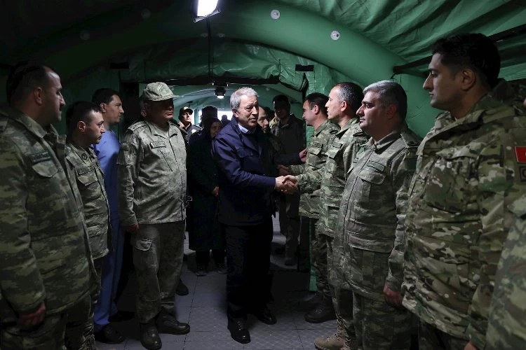Türk Silahlı Kuvvetlerinin, Kara, Deniz ve Hava Kuvvetlerinin tüm unsurlarının, karargâh ve birliklerinin ilk andan itibaren seferber olduğunu, AFAD ve valiliklerin koordinesinde görevinin başında olduğunu vurgulayan Bakan Akar, Azerbaycan'dan gelerek hastanede görev alan 12 askerî hekim ve 8 hemşireye de çalışmalarından dolayı teşekkür etti.