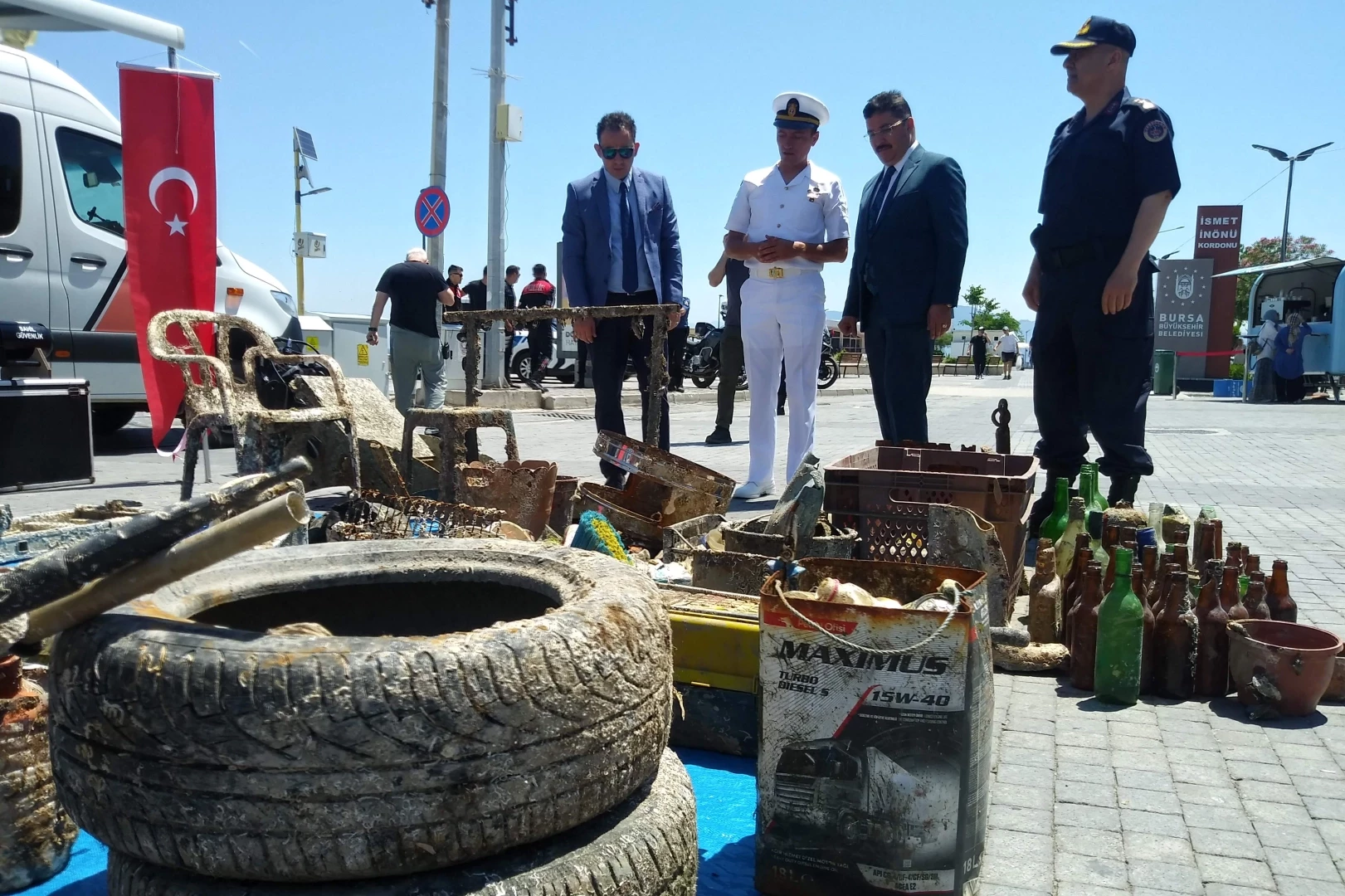 5 Haziran Dünya Çevre Günü dolayısıyla Mudanya’da Sahil Güvenlik Komutanlığı'na bağlı dalgıçlar tarafından yapılan deniz dibi temizliğiyle bin 700 kilogram katı atık toplanarak, toplananlar Mütareke Meydanı’nda sergilendi.
