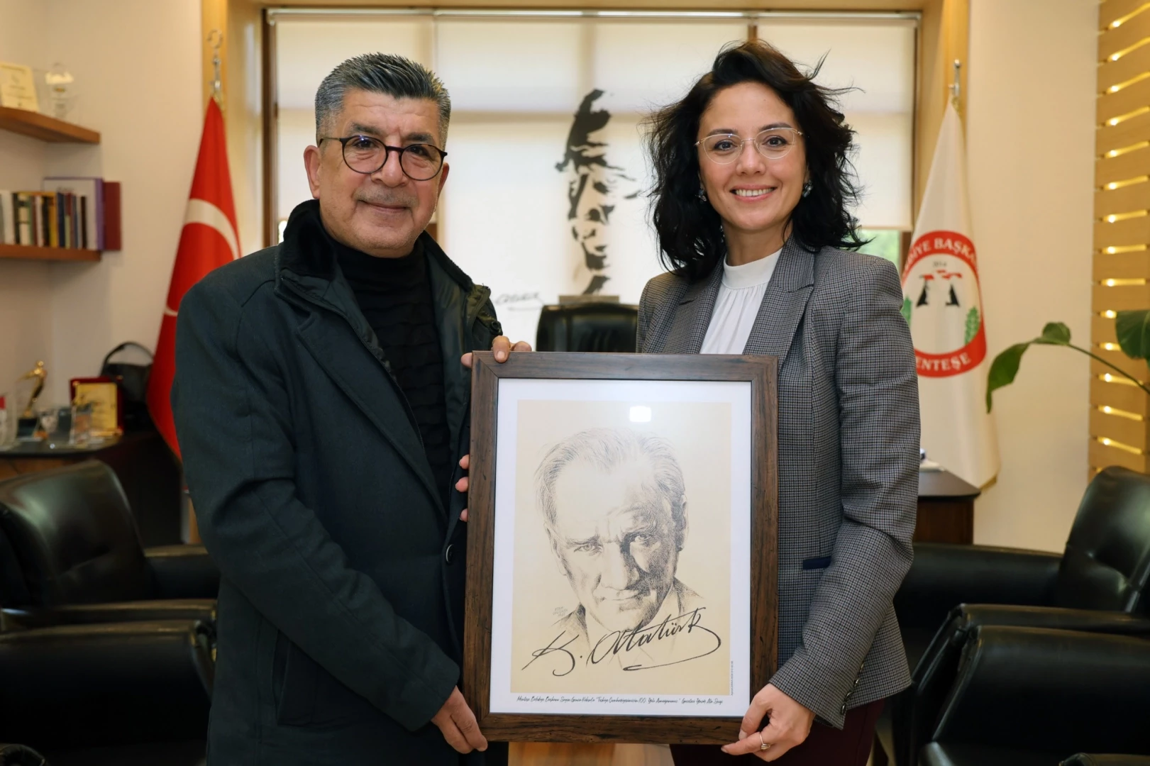 Gazeteci Sevgi, Başkan Köksal’a bir sürpriz yaparak, ünlü Atatürk ressamı üstad Etem Çalışkan’ın 1969 yılı çizimi olan, Atatürk’ün imzasının da yer aldığı portresinin isme özel hazırlanmış baskı örneğini, “Türkiye Cumhuriyetinin 100. Yılı ve ikinci yüzyılının 1. Yılı” armağanı olarak takdim etti.