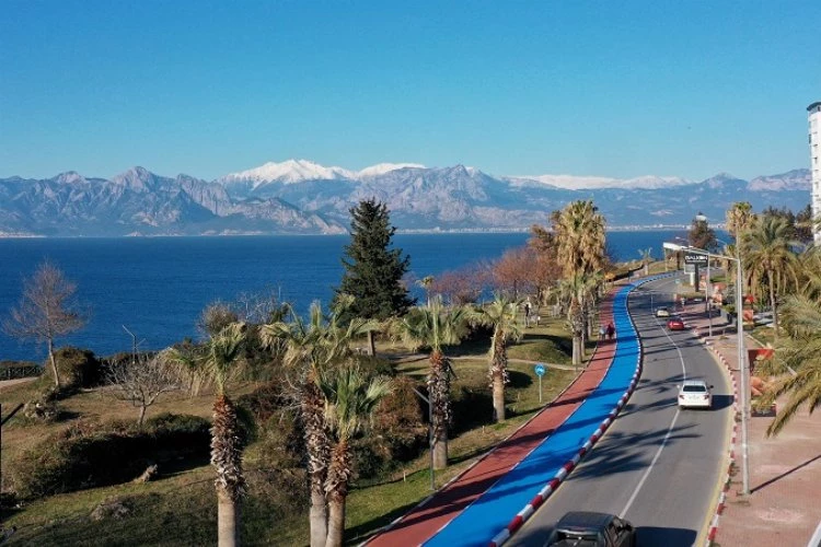 ANTALYA (İGFA) - Antalya’nın doğa harikası falez kıyı bandında plajları, Deniz Yüzü, Dağ Yakası ve Kültür kafeleri, Antalya Lokantası ve parklarıyla bütünlüklü bir yaşam alanı oluşturan Muratpaşa Belediyesi, yaklaşık 5 kilometrelik eski Lara Caddesi’nde bisiklet yolunu yeniden boyadı. Deniz kenarı boyunca devam eden bisiklet yolunda çalışmalar günün erken saatlerinde başladı. Ekipler bir yandan yolu maviye boyadı diğer yandan bozulan kısımları tamir etti.