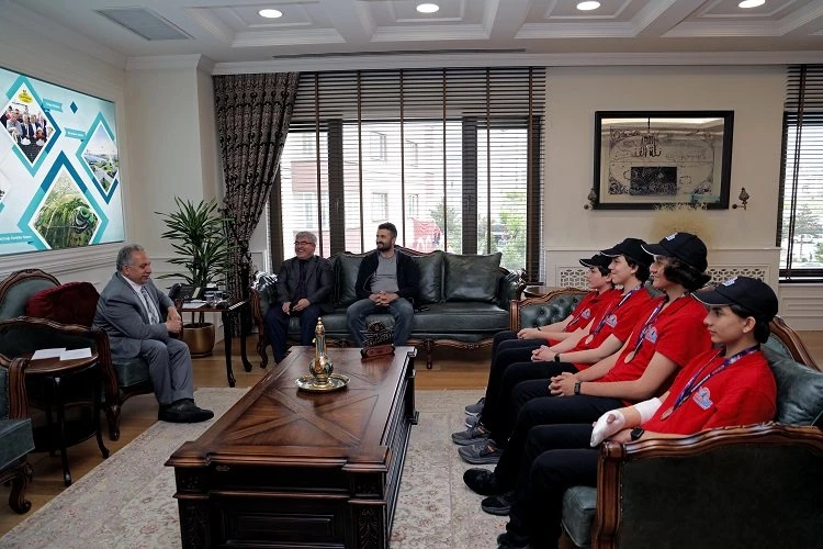 Başkanlık makamındaki ziyarete 50. Yıl Dedeman Fen ve Teknoloji Anadolu İmam Hatip Lisesi Müdürü Ahmet Oğuz, öğretmen Can Evren Yıldız ve yarışmada dereceye giren öğrenciler Ertuğrulhan Yağmur, Ahmet Taha Demir, Fikri Eren Yıldırım ve Beşir Yasin Kalın katıldı.