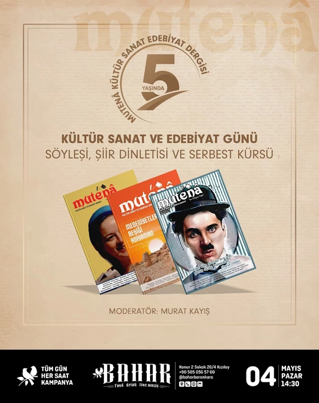 Mutenâ’nın üçüncü etkinliği ise 4 Mayıs Pazar günü saat 14.30’da Ankara Kızılay’da bulunan Bahar Bar’da yapılacak. Bahar Bar’ın ev sahipliğinde gerçekleşecek programda; söyleşi, şiir dinletisi ve serbest kürsü başlıklarıyla sanatseverlere açık bir ifade alanı sunulacak. Ankara’daki etkinliğe de geniş katılım bekleniyor.