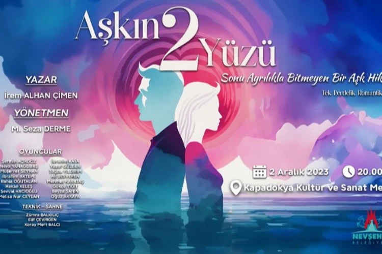 Nevşehir Belediyesi Kültür ve Sosyal İşler Müdürlüğü bünyesinde faaliyetlerini sürdüren Nevşehir Belediyesi Şehir Tiyatrosu, yılın son oyununu sahnelemeye hazırlanıyor. Şehir Tiyatrosu oyuncuları, 2 Aralık 2023 Cumartesi günü “Aşkın 2 Yüzü” adlı tek perdelik romantik komedi türündeki oyunlarıyla sanatseverlerle buluşacak. İrem Alhan Çimen’in yazdığı ve M.Seza Derme’nin yönetmenliğini yaptığı oyuna 13 yaş altındaki çocuk izleyiciler kabul edilmeyecek.