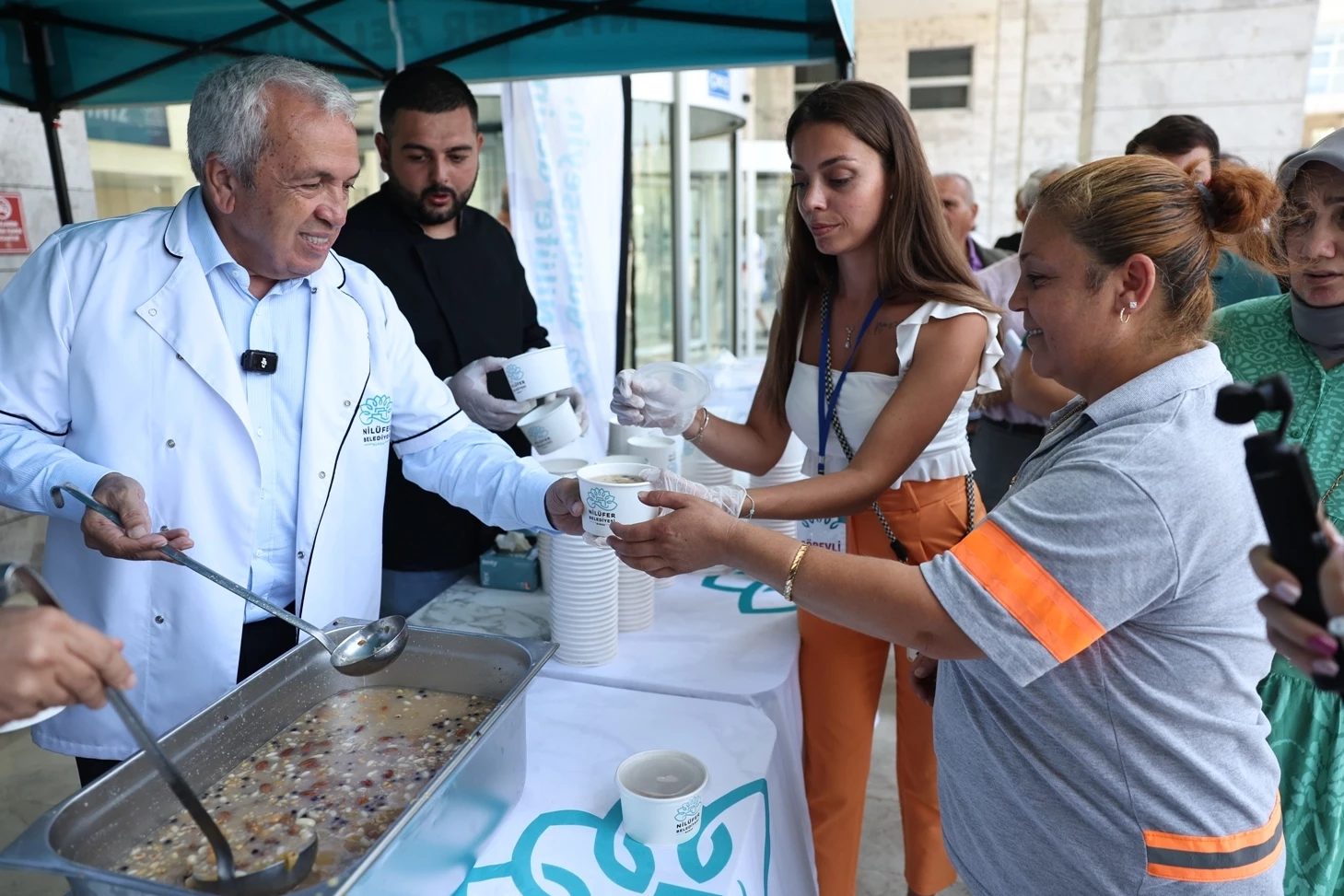 Nilüfer Belediye Başkanı Şadi Özdemir, eşi Nuray Özdemir ve başkan yardımcılarıyla birlikte Halk Evi önündeki aşure dağıtımına katıldı.