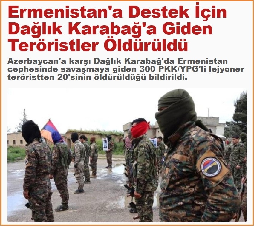 Bundan önceyse 'Suriye İnsan Hakları Gözlemevi - SOHR' tarafından 1 Ekim 2020'de açıklanan bilgilerde, Suriye'den Ermenistan'a yardım etmek üzere paralı savaşçıların getirildiği yönündeki bilgiler bir daha doğrulandı. Bilgide, 'güvenilir kaynakların SOHR'a Ermeni ve Arap kökenli Suriyeli savaşçıların Azerbaycan'a karşı savaşta kullanılmak üzere Ermenistan'a götürüldüğünü söylediği' belirtildi.