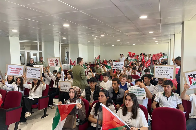 Program kapsamında okul salonu Filistin bayrakları ve tematik afişlerle süslendi. Etkinlikte öğrenciler, Filistin temalı şarkılar seslendirdi; barış, özgürlük ve dayanışma mesajları verildi.