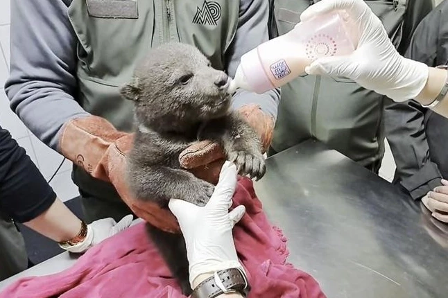 Yavru boz ayıya Ovakorusu Ayı Barınağı'ndaki ekipler, anne şefkatiyle yaklaşıyor ve besleme ile bakımına büyük özen gösteriyor.
