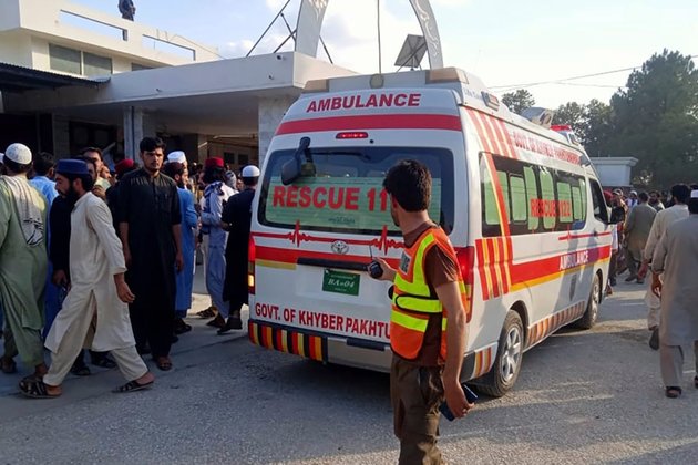 İlk müdahale ekipleri, 30 Temmuz 2023, Pakistan'ın Hayber Pakhtunkhwa kentinin Bajur bölgesinde meydana gelen bomba patlamasının ardından yaralı bir adamı ambulansa taşıyor. (AP aracılığıyla Kurtarma 1122 Karargahı)
