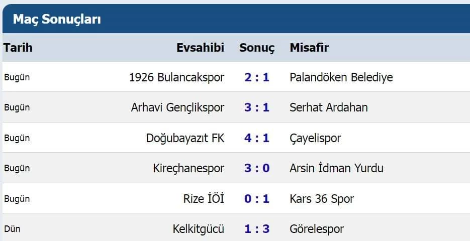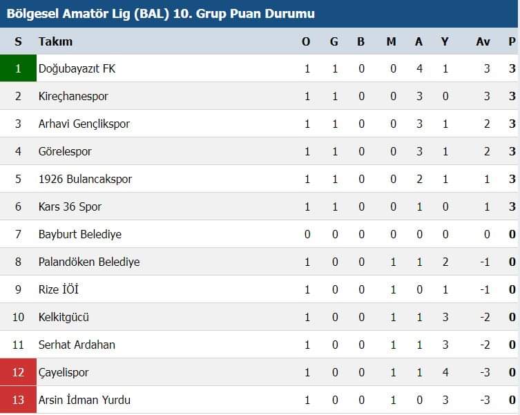 PALANDÖKEN BELEDİYE SPOR KÖTÜ BAŞLADI... İlimizi bölgesel amatör ligde temsil eden takımımız bugün deplasmanda oynadığı maçta rakibi Bulancak Spora 2-1 mağlup olarak lige kötü bir başlangıç yapmış oldu. Sahaya çıkan ilk 11 şu şekildeydi. Oğuzhan Yusuf Münir Mahmut Ömer Yasin Doğulan Erhan Bekir Alperen Abdullah Muammer Bulancak Spor 2 -1 Palandöken Belediye Spor Tum1haber/medya/spor/Ferit Karakoca Grubumuzdaki ilk hafta sonunda oluşan puan durumu