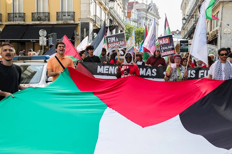 Lizbon sokaklarına çıkan göstericiler, siyonist işgalinin Filistin halkına karşı uyguladığı soykırımın sona ermesi ve Filistin'e özgürlük çağrısı yapan sloganlar attı.