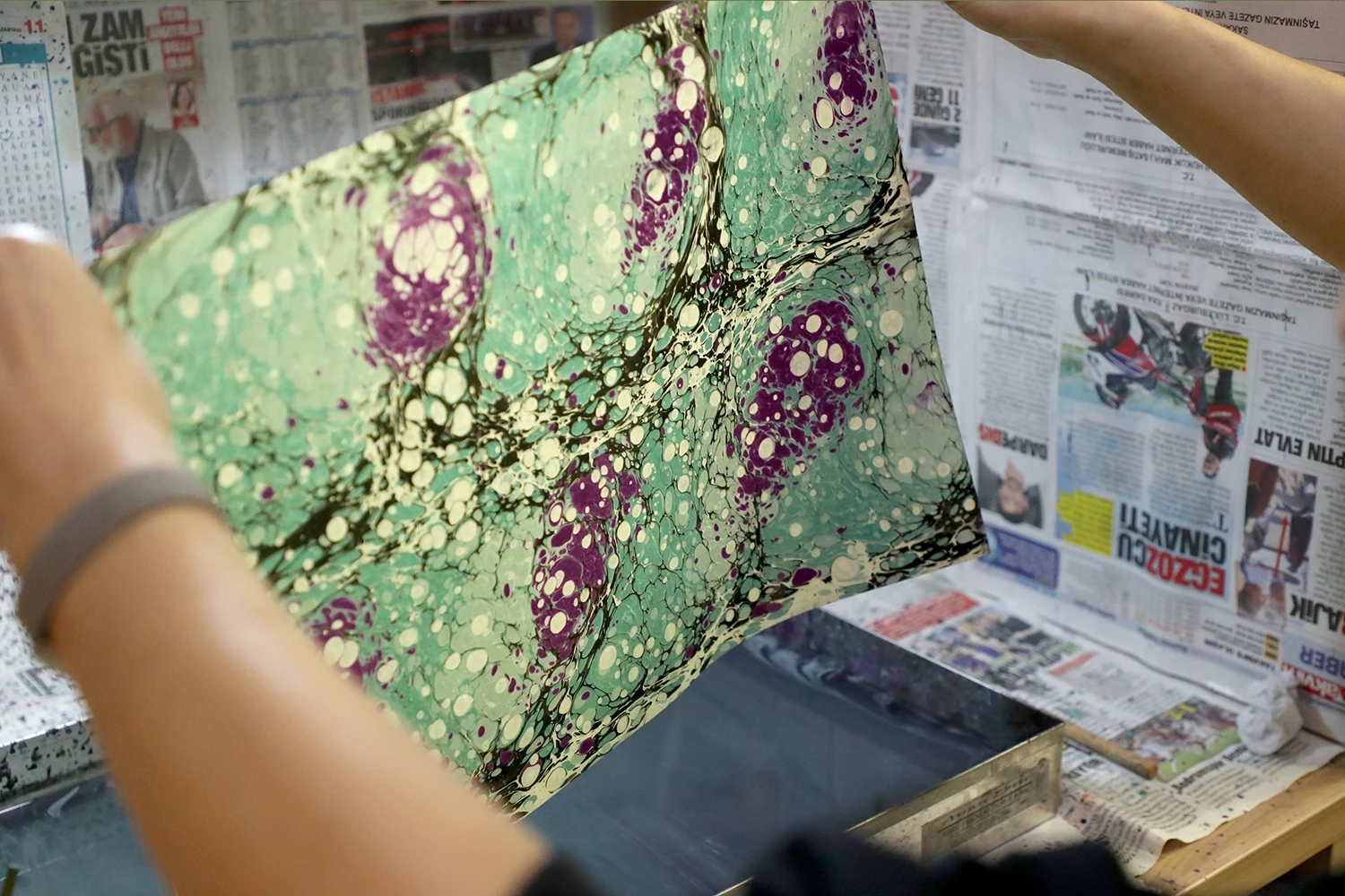 Zorlu ve emek isteyen bir geleneksel sanat olan ebru derslerinde kursiyerler, geleneksel değerlerle geleceği birleştiren benzersiz bağın bir parçası oluyor.
