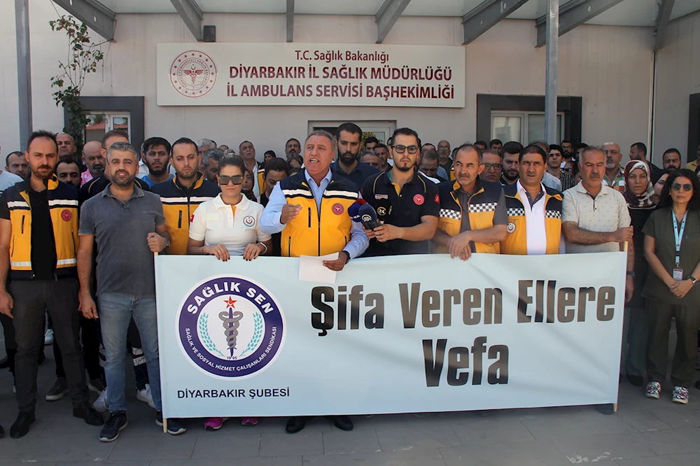 İl ambulans servisi başhekimliğine bağlı 24 nolu acil sağlık hizmetlerinde görev yapan 4 personelin saldırıya uğraması olayını kınamak üzere Sağlık-Sen Diyarbakır Şubesi, merkez Yenişehir ilçesinde bulunan İl ambulans servisi başhekimliği önünde basın açıklaması yaparak olayı kınadı.