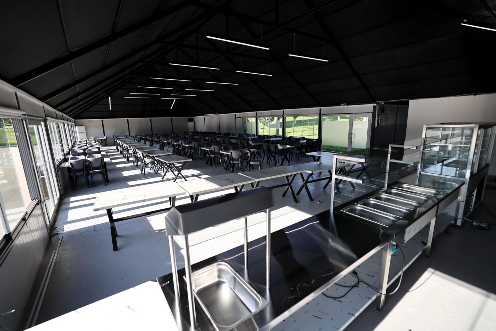 Büyükşehir Belediyesi güvencesiyle kampüs içerisinde helikopter pistinde hazırlanan tesis, sulu yemek çeşitleriyle günlük bin kişiye hizmet verebilecek kapasiteyle hazırlandı.