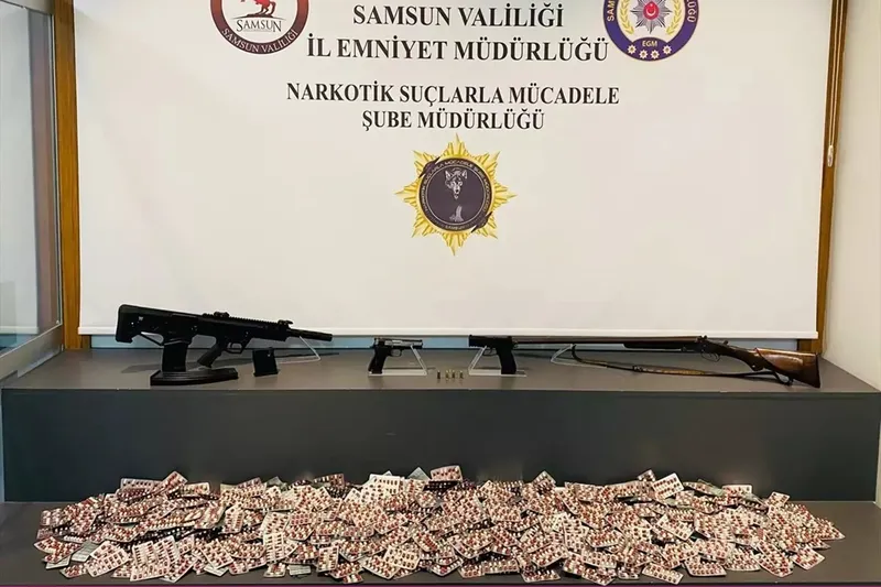 İl Emniyet Müdürlüğü Narkotik Suçlarla Mücadele Şubesi ekiplerince, Atakum ilçesinde belirlenen adreslerde yapılan aramada 10 bin 192 sentetik ecza hapı, 2 ruhsatsız tabanca ile 2 ruhsatsız tüfek ele geçirildi.