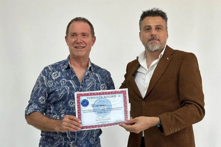 Söyleşi sonunda Doç. Dr. H. Kürşat Çelik, sanatçı Sümer Ezgü'ye teşekkür belgesi takdim etti.