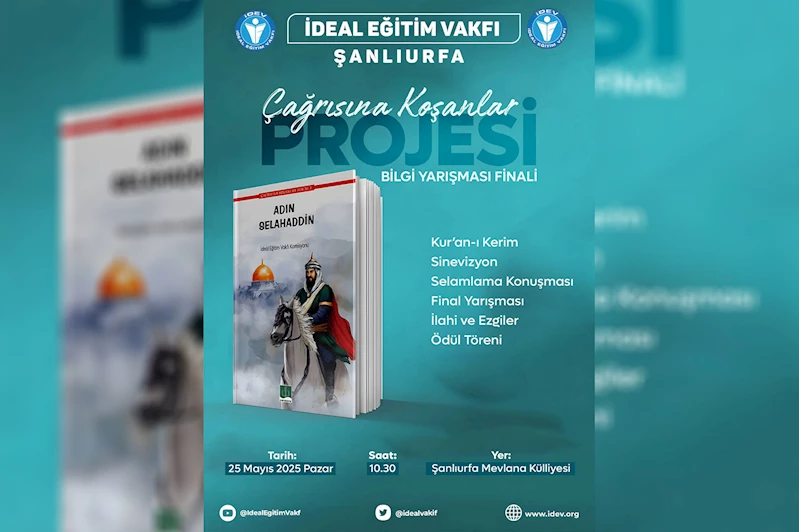 İdeal Eğitim Vakfı (İDEV) Şanlıurfa Temsilciliği “Çağrısına Koşanlar Projesi” kapsamında yürüttüğü kitap okuma ve bilgi yarışması sürecinin final programını 25 Mayıs 2025 Pazar günü saat 10.30’da Şanlıurfa Mevlâna Külliyesi'nde gerçekleştirecek.