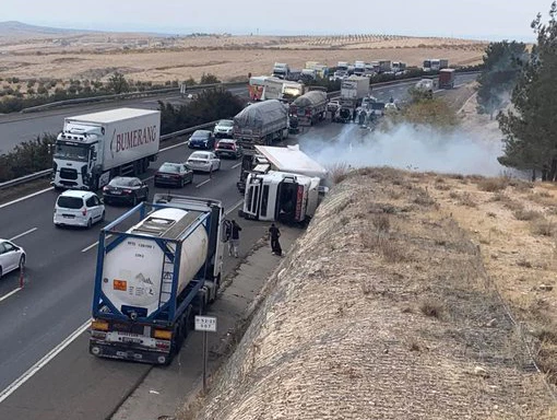 Alınan bilgiye göre, R.A idaresindeki 33 R 5717 plakalı tır, Şanlıurfa-Gaziantep Otoyolu Birecik kesimi gerçekleştirilen yol yapım çalışması bölgesinde karşı şeride geçerek İ.Ö yönetimindeki 63 HK 063 plakalı otomobille çarpıştı. Kazanın etkisiyle tır yola devrildi.