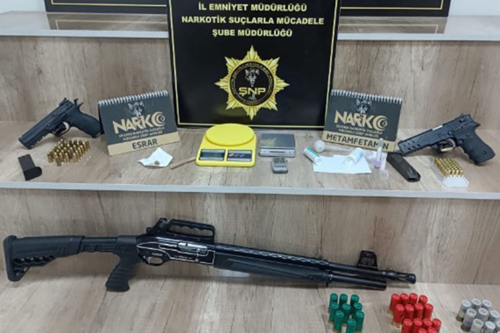 Yapılan aramada, 40 gram sentetik uyuşturucu, 3 hassas terazi, bir uyuşturucu kullanma aparatı, 2 ruhsatsız tabanca, bir ruhsatsız av tüfeği ve 115 mermi ele geçirildi.