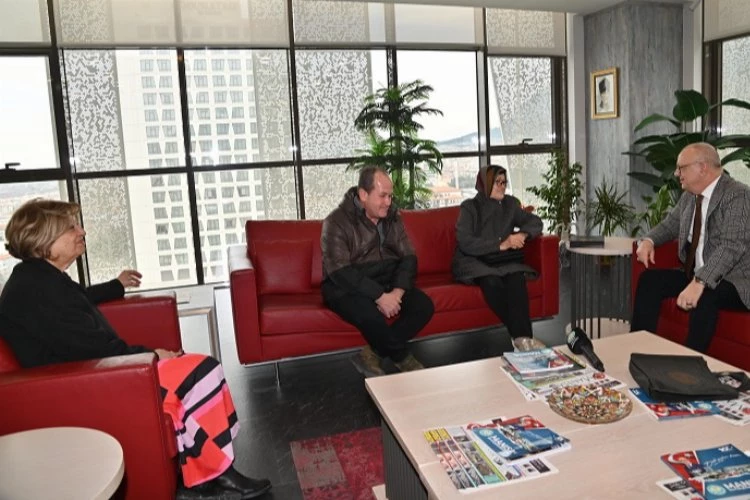 MANİSA (İGFA) - Kayseri'de Erkilet 12’nci Hava Ulaştırma Ana Üs Komutanlığından eğitim uçuşu için havalanan askeri nakliye uçağının düşmesi sonucu 2001 yılında şehadet şerbetini içen Pilot Üsteğmen Okan Divrik’in annesi Nevin Divrik ile kardeşi Hakan Divrik, Manisa Büyükşehir Belediye Başkanı Cengiz Ergün’ü ziyaret etti. Anne Nevin Divrik’i elini öperek karşılayan Başkan Ergün, ziyaretleri nedeniyle teşekkür etti.