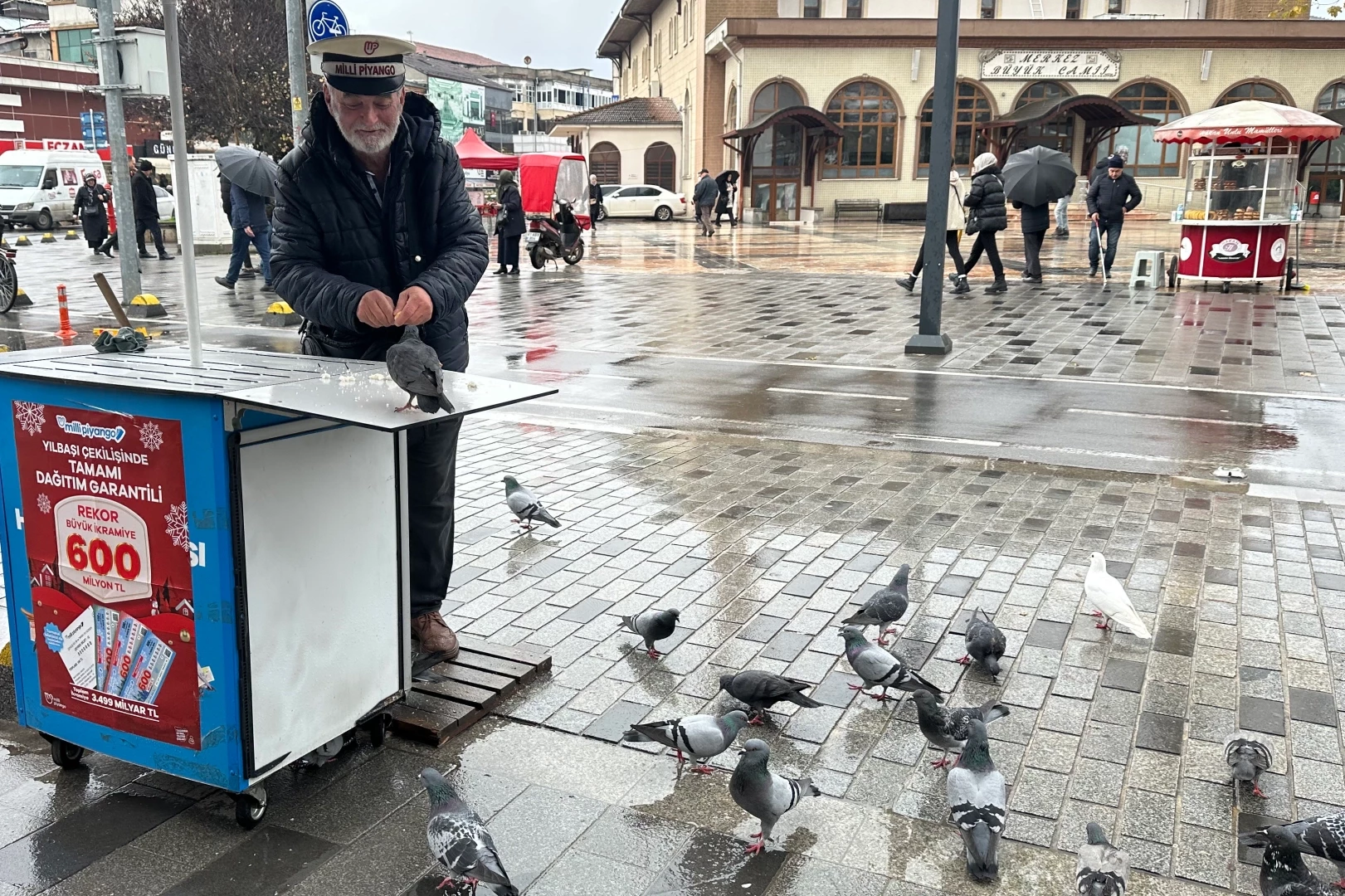 Düzce'de bir seyyar 'talih kuşu' bayii güvercinleri kendi elleriyle besledi.
