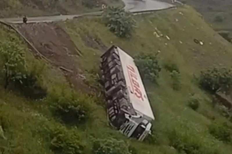 Henüz plakası ve sürücüsünün kimliği öğrenilemeyen tır, bilinmeyen bir nedenle sürücüsünün direksiyon hakimiyetini kaybetmesi sonucu yoldan çıkarak şarampole devrildi.