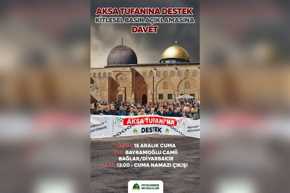 HAMAS'ın askeri kanadı İzzeddin El-Kassam Tugayları'nın siyonist işgalcilere karşı başlattığı "Aksa Tufanı" operasyonuna destek; siyonist işgal rejiminin katliam ve soykırımını tel'in etmek amacıyla, Peygamber Sevdalıları Vakfı tarafından bugün Diyarbakır'da kitlesel basın açıklaması düzenlenecek.