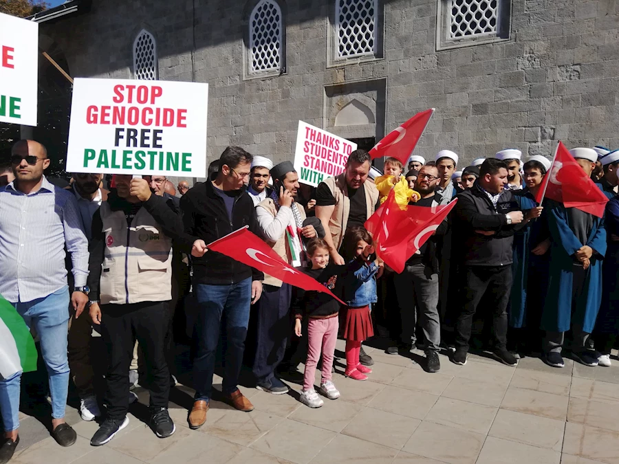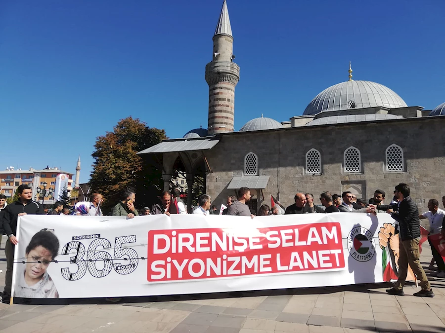 Erzurum Sivil Toplum Platformu organizasyonunda, Erzurum Lalapaşa Camii önünde toplanan vatandaşlar ve STK temsilcileri soykırımın 365. gününde katil israili lanetleyerek, beddua edip slogan attı. Erzurum Sivil Toplum Platformu Adına Eğitim Bir-Sen Şube Başkanı Mustafa Karataş’ın yaptığı telin konuşmasının ardından sessizce dağıldı.