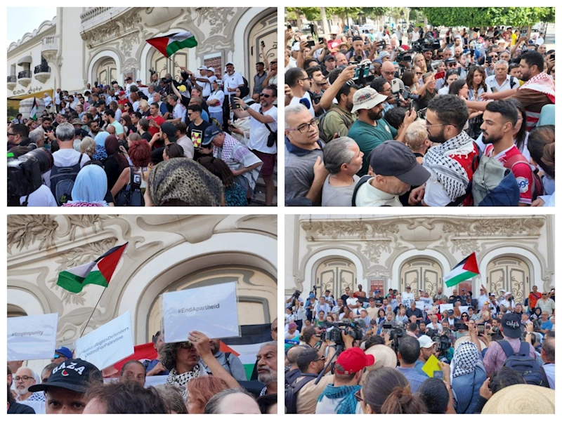 Tunus açıklarında demirleyen Küresel Sumud Filosu’nun amiral gemisinin insansız hava aracıyla saldırıya uğramasının ardından Tunus’un başkenti Tunus’ta geniş katılımlı bir basın açıklaması düzenlendi.