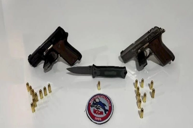 Yapılan aramada; 2 adet 7.65 mm çapında ruhsatsız tabanca, 2 adet şarjör, 19 adet 7.65 mm çapında fişek ve 1 adet kesici alet ele geçirildi.