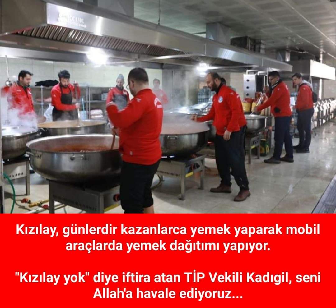 ŞUURSUZ KİFAYETSİZLERİN EN İYİ BİLDİĞİ İŞ PROVOKASYON Türkiye İşçi Partisi Milletvekili Sera Kadıgil'den Kızılay provokasyonu: “Bir tane Kızılay çadırı gören var mı? Çorba dağıtan Kızılay var mı? Niye? Başkanı İlahiyat mezunu.” Kızılay’ın günlerdir çadır kentleriyle, seyyar mutfak, hastane ve ambulanslarıyla verdiği hizmetleri görmezden gelen bu şuursuza cevap aşağıdaki resimde. Grey Wolf