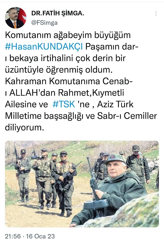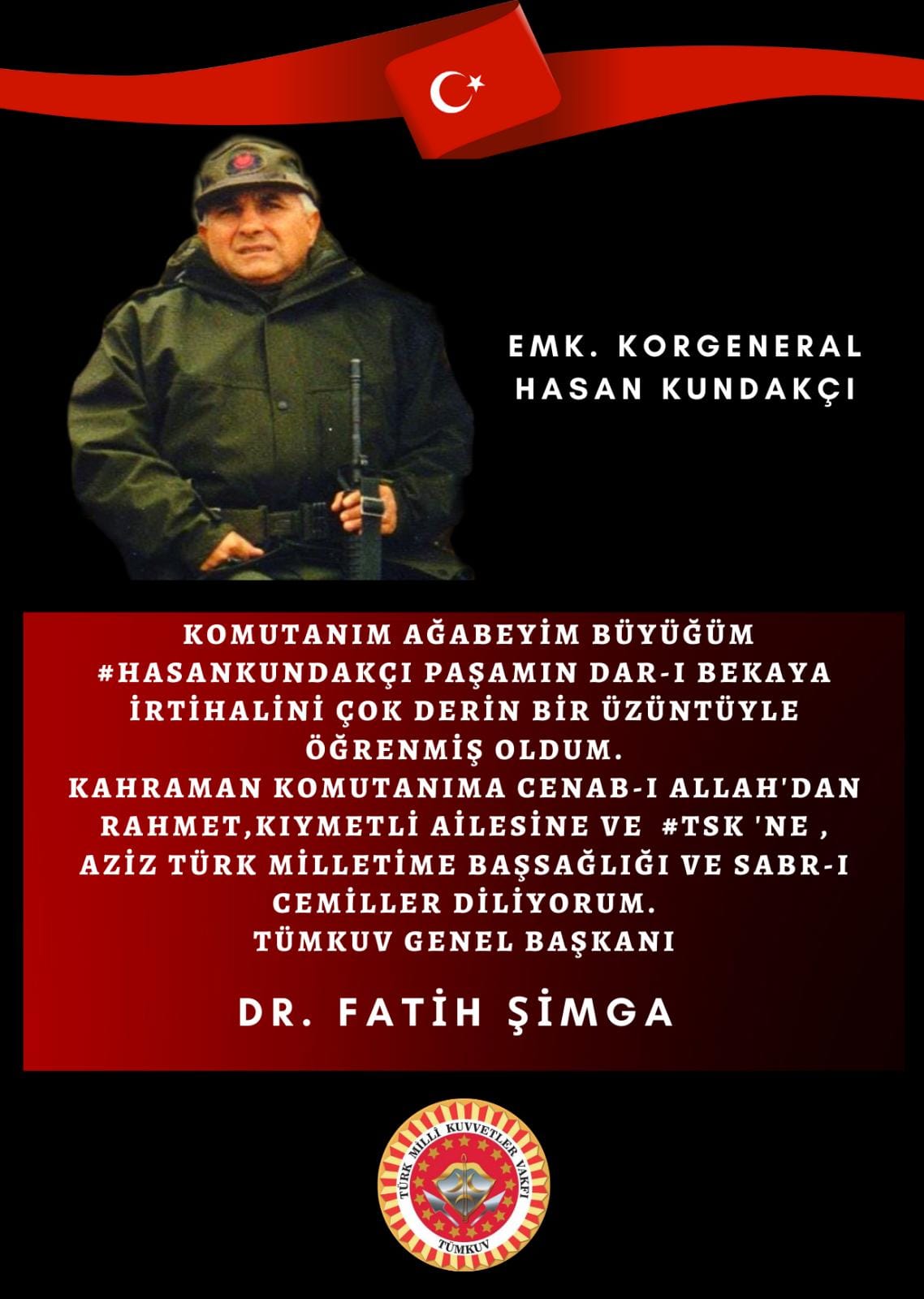 Komutanım ağabeyim büyüğüm Hasan KUNDAKÇI Paşamın dar-ı bekaya irtihalini çok derin bir üzüntüyle öğrenmiş oldum. Kahraman Komutanıma Cenab-ı ALLAH'dan Rahmet,Kıymetli Ailesine ve TSK 'ne , Aziz Türk Milletime başsağlığı ve Sabr-ı Cemiller diliyorum.' Türk Milli Kuvvetler Vakfı Genel Başkanı Dr.Fatih ŞİMGA