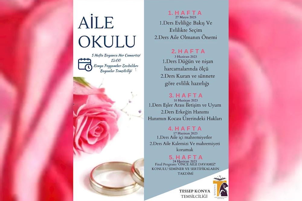 TESSEP (Tesettür Seferberliği ve Erdemli Kadınlar Derneği), toplumun ıslahı, ihya ve inşası için mihenk taşının aile yapısının, sağlıkla, huzurla sürdürülebilmesi için daha önce Türkiye'nin pek çok ilinde hayata geçmesi 'Aile Okulu' projesini Konya'da da hayata . TESSEP Konya İl Temsilciliği; genç evliler, yeni evlenenler ve evlilik dönemlerine yönelik olanlara yönelik 'Aile Okulu' projesi kapsamında beş haftalık bir program düzenleyeceğini duyurdu.  'Aile Okulu' projesi kapsamında evliliğe bakış, evlilikte seçim, aile terbiyesinin önemi, düğün ve nişan harcamalarındaki ölçü, Kur'an ve sünnete göre evlilik hazırlığı, eşler arası iletişim ve uyum, eşlerin hakları üzerindeki hakları, aile içi mahremiyetler, aile kalemizi korumak gibi başlıklar altında seminerler düzenlenecek. İlk seminer, Konya Peygamber Sevdalıları bayanlar Derneği'nin seminer salonu, 27 Mayıs Cumartesi günü saat 13.00'te gerçekleşecek. Projeye süreklilik gösteren her güce ya sertifika verileceği belirtilen sonunda, seminerlerin sonucu yapılacak yarışmada girenlere ise değerlendirmelerin verileceği belli değil.