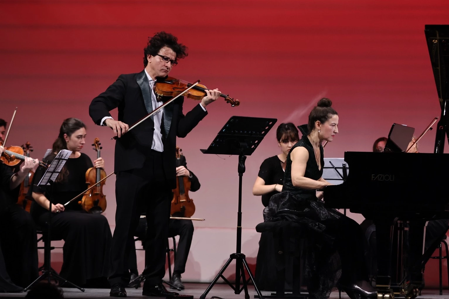 Konserin solistleri olarak, Başkemancı Özcan Ulucan; kendisi gibi TEV yurt dışı(Londra) mezun bursiyeri Piyano Sanatçısı ve Pedagog Birsen Ulucan sahne aldı. Bununla birlikte keman sanatçıları; Buse Aksel, Nehir Ulutan, Berkin Bayrak, Atiye Eşkiza, Rüzgâr Turgay, Furkan Ayhan, Efe Çankal viyola sanatçıları; Burcu Yazıcı, Bengi Bahar Işkıncı, Dilan Kebir çello sanatçıları; Ozan Evrim Tunca, Gupse Şevval Aydın, Özgür Deniz Akalın kontrabas sanatçısı; Deniz Akgün ile birlikte toplam 16 üye orkestrada yer aldı.