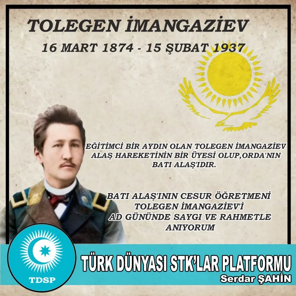 İmangaziev Tolegen bir eğitimci, Alaş hareketi üyesi, Alaş Partisi üyesi, Orda'nın Batı Alaş'ıdır.