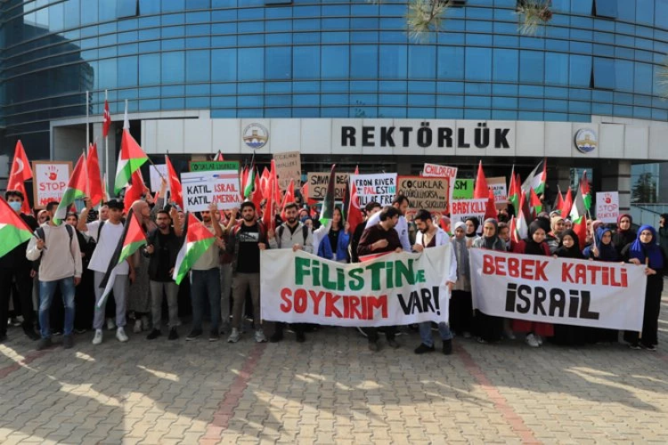 Erdoğan DEMİR / İsrail'in Filistin'e yönelik saldırılarını protesto etmek amacıyla, öğrencilerimiz Bolcaana Yemekhanesi önünde toplanarak ellerindeki pankartlarla rektörlük binasına kadar yürüdü.