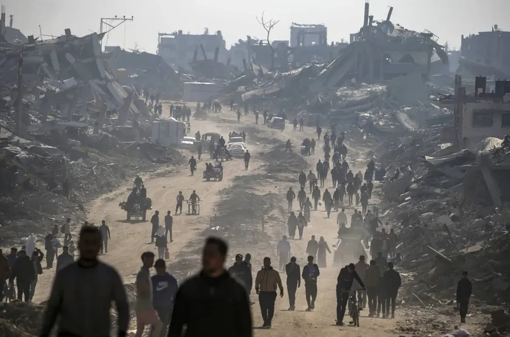 Resim Gazze Şeridi'nin kuzeyindeki Cibaliye'de yıkılan binaların enkazı arasında yürüyen insanlar, 30 Ocak 2025 (Reuters)