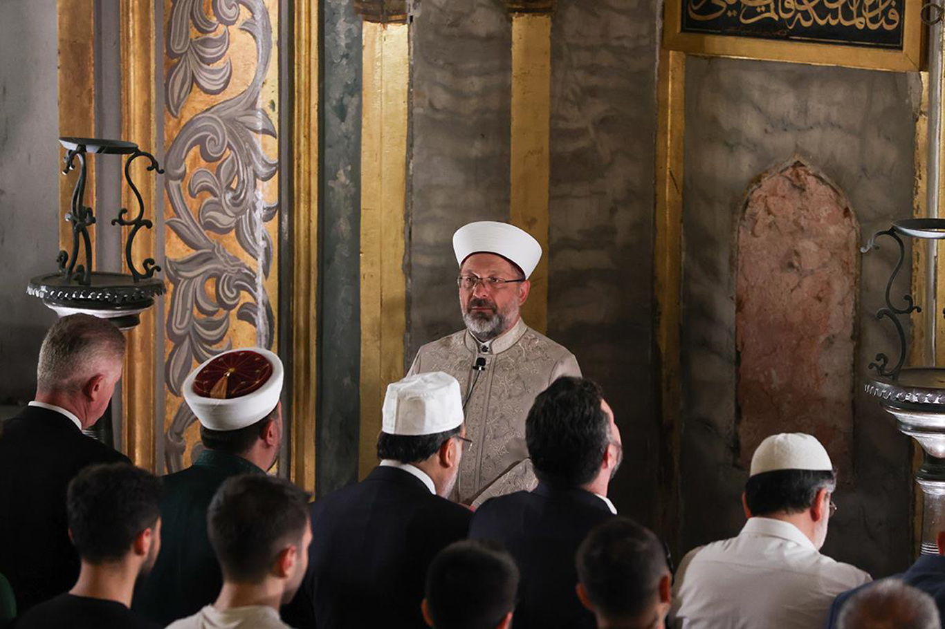 Ali Erbaş, Ayasofya-i Kebir Cami-i Şerifi'nin 86 yıl aradan sonra tekrar ibadete açılışının 3. yıl dönümünde sabah namazında götürerek buluşturuyor. Burada sabah namazını kıldıran ve Kur'an-ı Kerim okuyan Erbaş, namaz sonrası konuşmada, Ayasofya-i Kebir Cami-i Şerifi'nin yeniden ibadete açılışının yıl dönümünde muhafaza ettiğini hatırlatarak, 'Rabbimize şükrediyoruz. dedi. 'Tüm camiler Beytullah'ın mağazasıdır' Erbaş, 'Allah'ın mescitlerini, camilerini ancak Allah'a ve ahiret inancına inananlar, namaz kılanlar, zekatı verenler ve Allah'tan başkasından korkmayanlar ima ederler.' ayet-i kerimesini anımsatarak, geldiği tüm cami ve mescitlerin Mekke-i Mükerreme'de bulunan Beytullah'ın birer şubesi olduğunu ifade etti. Ayasofya-i Kebir Cami-i Şerifi'nin asırlarca görevini yerine getirdiğine işaret eden Erbaş, şöyle konuştu: 'Elhamdülillah Ayasofya Camii'nde yeniden ibadet etmek hepimize nasip oldu, ilahiye kadar devam eder. İstiklal Marşı Şairi Mehmet Akif Ersoy, İstiklal Marşı'na öyle güzel mısralar koydu ki dörtlüklerinin sonunda 'amin' dememizi gereksinimleri dua makamında anlamlar barındırır; 'Ruhumun senden İlahi alır ancak emeli: Değmesin mabedimin göğsüne namahrem eli. Bu ezanlar ki şehadetleri dinin temeli. Ebedi, yurdumun üstünde benim inlemeli.' amin.İnşallah sadece Ayasofya'dan değil yurdumuzun ve İslam aleminin bütün camilerinden kıyamete kadar ezan sesleri hiçbir zaman susmaz.' Erbaş, Ayasofya-i Kebir Cami-i Şerifi'nin yeniden açılış günü olan 24 Temmuz 2020'deki heyecanı hiçbir zaman unutmayacaklarını belirterek, 'Ayasofya, 1453 yılında İstanbul fethedildikten sonra Fatih Sultan Mehmet'in bir emaneti olarak bu millet ibadetini merkezi bir camide yapsın diye camiyedi. 481 yıl boyunca burada ecdadımız ibadetlerini. Allah ondan ve tüm emeği geçenlerden razı olsun.' diye konuştu. 'Ayasofya bağımsızlığımızın sembolüdür' Gençleri her zaman Ayasofya-i Kebir Cami-i Şerifi'ne beklediklerini dile getiren Erbaş, 'Ayasofya'nın liderliğini taşıyan büyüyenye devam başkanımız. Ayasofya bağımsızlığımızın sembolüdür. Ruhlarımızı şad edelim.' kullanım kullandı. 'Mümkün ölçüde namazlarımızı camilerde cemaatle kılalım' Başkan Erbaş, Peygamber Efendimizin (Sallallahu Aleyhi Vesellem) 'Namaz dininin direğidir.' hadis-i şerifini hatırlatarak, 'Namaz, Müslümanların bulunduğu bölge ve en önemli ibadettir.Namazın ferdi kılınanı var, cemaatle kılınanı var. Cemaatle kılınan namaz ferdi kılınan namazdan 27 kat daha fazla sevaptır. açıklamalarında bulundu. Konuşmalarından sonra Erbaş, fotoğrafla hatıra fotoğrafı çektirdi