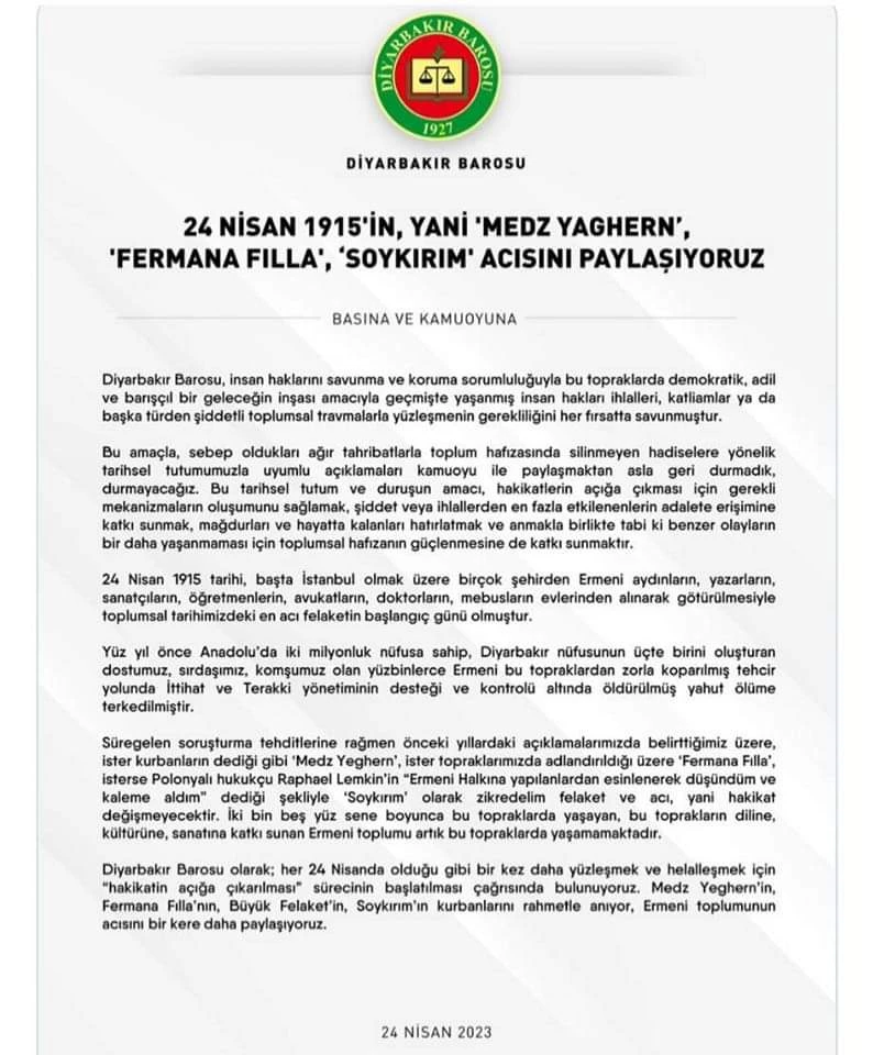 DİYARBAKIR BAROSU'NUN SÖZDE ERMENİ SOYKIRIMI HAKKINDAKİ AÇIKLAMASINA CEVAPTIR.