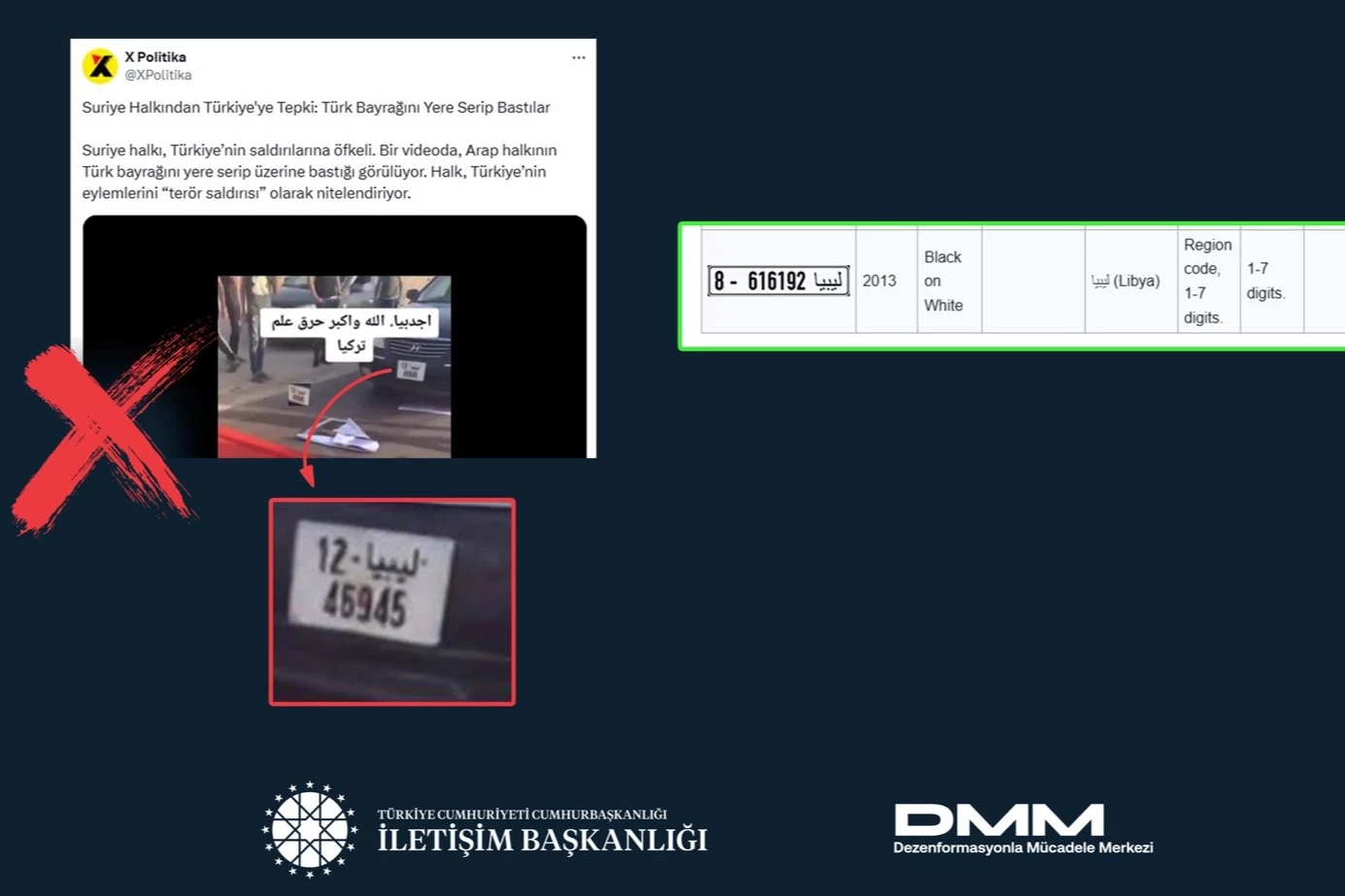 "Terör örgütü PKK/PYD propagandası yapan sosyal medya hesaplarından paylaşılan bazı görüntüler ile ilgili, 'Suriye halkı Türkiye'ye tepki göstermek için Türk Bayrağını yere serip bastı' iddiası doğru değildir" denilen açıklamada, "Görüntülerde yer alan araçların Libya plakalı olduğu belirlenmiştir. İddiaya konu saldırının Libya’da, Ulusal Mutabakat Hükümeti ve Türkiye karşıtı milislerce geçmiş yıllarda gerçekleştirildiği tespit edilmiştir. Bahse konu görüntülerin geçtiğimiz yıllarda da benzer asılsız iddialarla paylaşıldığı belirlenmiştir. Kamuoyunu manipüle etmeye yönelik ortaya atılan asılsız iddialara itibar etmeyiniz" ifadeleri yer aldı.