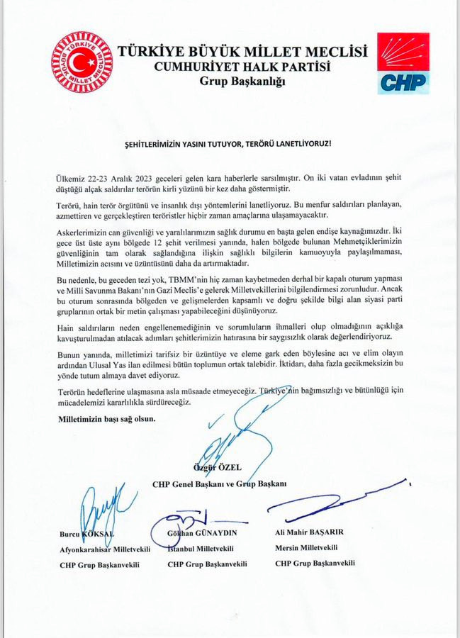 "İki gece üst üste aynı bölgede 12 şehit verilmesi yanında, halen bölgede bulunan Mehmetçiklerimizin güvenliğinin tam olarak sağlandığına ilişkin sağlıklı bilgilerin kamuoyu ile paylaşılmaması, milletimizin acısını ve üzüntüsünü daha da artırmaktadır. Bu nedenle, bu geceden tezi yok, TBMM'nin hiç zaman kaybetmeden derhal bir kapalı oturum yapması ve Milli Savunma Bakanı'nın Gazi Meclis'e gelerek milletvekillerini bilgilendirmesi zorunludur. Ancak bu oturum sonrasında bölgeden ve gelişmelerden kapsamlı ve doğru şekilde bilgi alan siyasi parti gruplarının ortak bir metin çalışması yapabileceğini düşünüyoruz. Hain saldırıların neden engellenemediğini ve sorumluların ihmalleri olup olmadığının açıklığa kavuşturulmadan atılacak adımları şehitlerimizin hatırasına bir saygısızlık olarak değerlendiriyoruz."