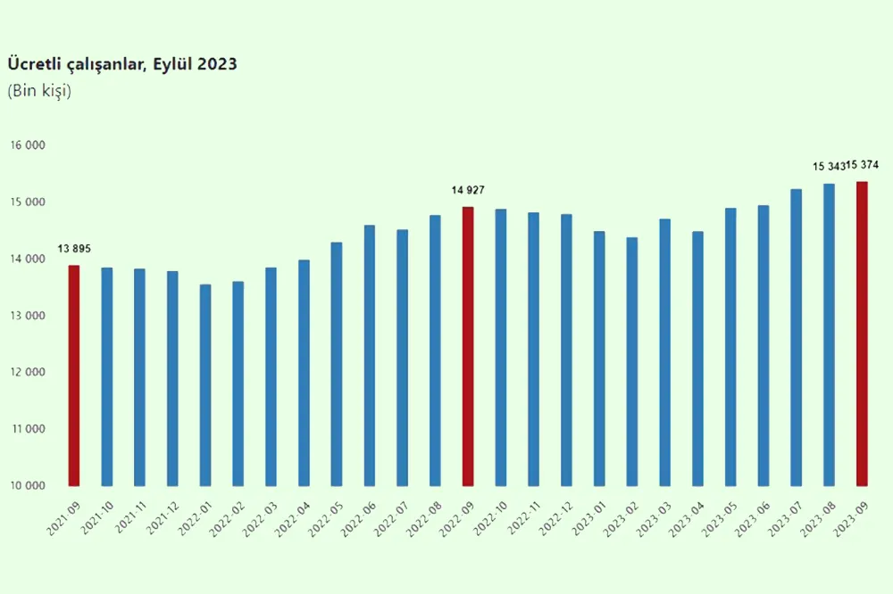 Sanayi, inşaat ve ticaret-hizmet sektörleri toplamında ücretli çalışan sayısı 2023 Eylül ayında bir önceki yılın aynı ayına göre yüzde 3,0 arttı. Ücretli çalışan sayısı bir önceki yılın aynı ayında 14 milyon 926 bin 919 kişi iken, 2023 yılı Eylül ayında 15 milyon 374 bin 379 kişi oldu.