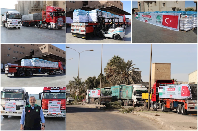 Başkenti Kahire yakınlarında bulunan depolarda stokladığı gıda, giyim, yatak ve yastık gibi acil ihtiyaçlardan oluşan 2 tırlık yardımı dün yola çıkaran Umut Kervanı, bugün ise bir un fabrikasından direkt olarak aldığı 55 ton unu tırlara yükleyerek Gazze'ye doğru yola çıkardı.