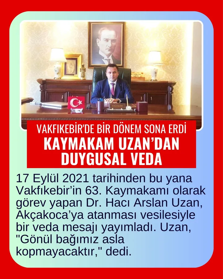 17 Eylül 2021 tarihinden bu yana Vakfıkebir’in 63. Kaymakamı olarak görev yapan Dr. Hacı Arslan Uzan, Akçakoca’ya atanması vesilesiyle bir veda mesajı yayımladı. Uzan, "Gönül bağımız asla kopmayacaktır," dedi.
