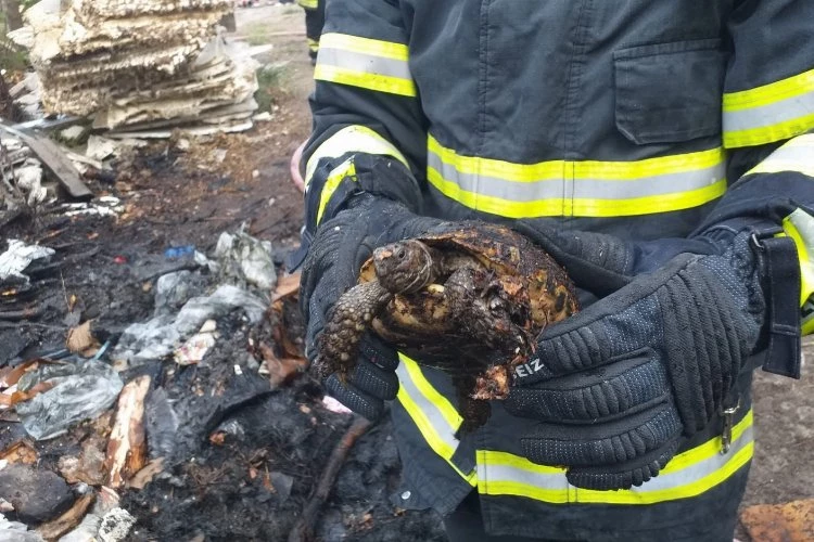 Kocaeli İtfaiyesi Dilovası’nda müdahale ettiği yangında kaplumbağayı son anda yanmaktan kurtardı.