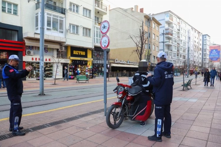 Eskişehir Büyükşehir Belediyesi Zabıta Dairesi ekipleri araç trafiğine kapatılarak yayalaştırılmış yollarda motosiklet, elektrikli bisiklet ve scooter kullanımına yönelik denetimlerini aralıksız sürdürüyor. ESKİŞEHİR (İGFA) - Büyükşehir Belediyesi Zabıta Trafik Ekipleri motorlu taşıt trafiğine kapatılan ve araç geçişinin yasaklandığı bölgelere giriş yapanlara karşı denetimlerine ara vermeden devam ediyor. UKOME kararıyla her türlü motorlu taşıtlara girişi yasaklanan İki Eylül Caddesi ve İsmet İnönü Caddesi’ne giriş yapan motosiklet, elektrikli bisiklet ve scooter sürücülerine yaya güvenliğini tehlikeye düşürdükleri için Encümen’e sevk edilmek üzere idari yaptırım kararı uygulandı. Ekipler denetimlerin devam edeceğini belirterek yaya güvenliği için yasak bölgelerde her türlü araç geçişinin yasak olduğunu hatırlattılar. Büyükşehir Belediyesi Zabıta Dairesi Başkanlığı yetkilileri paket dağıtımı yapan iş yerlerinde çalışanların hızlı servis yapmaya zorlanmamaları, yaya bölgelerine girmemeleri ve tescil belgelerini yanlarında bulundurmaları gerektiğini belirttiler.